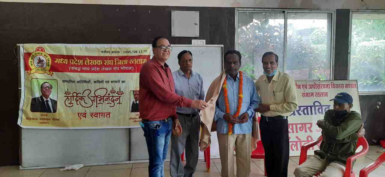 मध्यप्रदेश लेखक संघ के अध्यक्ष दिनेश चंद्र उपाध्याय”दीपक” के नेतृत्व मैं काव्य गोष्ठी का आयोजन सुमंगल गार्डन में रखा गया।कार्यक्रम में संस्था के सदस्यों द्वारा दीप प्रज्जवलित कर सरस्वती वंदना से शुरुआत की गई।इस अवसर पर संस्था अध्यक्ष दिनेश चंद्र उपाध्याय ने जावरा शहर के मशहूर शायर आरिफ अली का शाल एवम श्रीफल से सम्मान किया।आरिफ अली की ग़ज़ल जिंदगी पर अजाब तारी है फिर भी जीने की रस्म जारी है ग़ज़ल को श्रोताओ ने खूब सराहा।