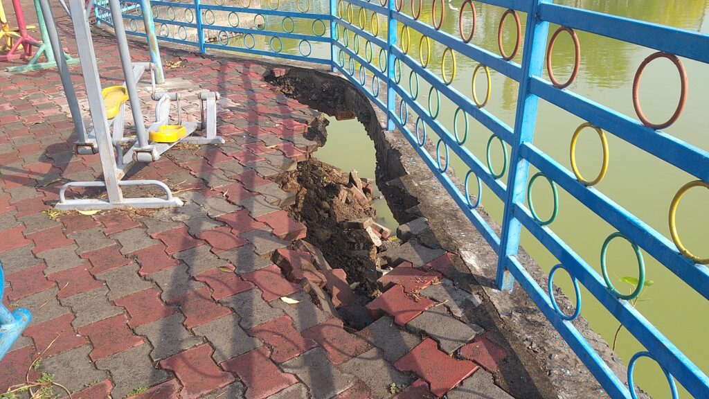 तालाब के एक छोर के ओर की जमीन धस कर पानी मे जा गिरी है।जो की एक बड़े गड्डे मे तब्दील होकर किसी जनहानी को न्योता दे रही है।जमीन धसने से रेलिंग का हिस्सा भी मानो हवा मे झूल रहा है जिससे की एक बड़ा हादसा कभी भी हो सकता है जिम्मेदारो को इस ओर ध्यान देना बहुत जरूरी है।