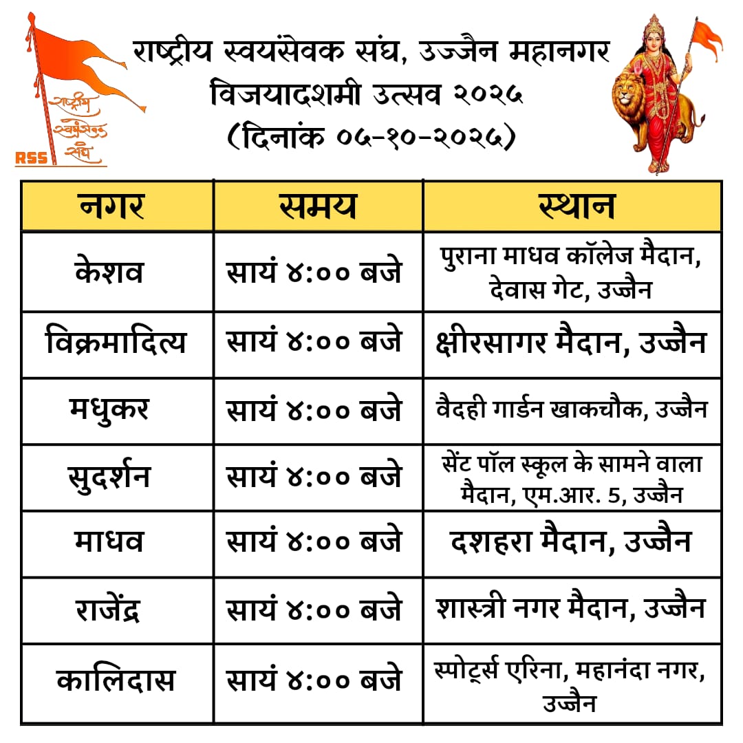 5. माधव नगर का पथ संचलन दशहरा मैदान से निकलकर सुराना पैलेस, सेठिनगर, लक्ष्मीनगर, अशोक नगर, सांदीपनि चौराहा, पुलिस कंट्रोल रूम, लिनन शोरूम से होते हुए पुनः दशहरा मैदान पर सम्पन्न होगा। अकृत जैन, चार्टर्ड एकाउंटेंट, वर्तमान अध्यक्ष – इंस्टिट्यूट आफ़ चार्टर्ड अकाउंटेंट्स, उज्जैन शाखा अध्यक्षता करेंगे एवं गिरीशजी, इंदौर कार्यक्रम के मुख्य वक्ता होंगे।