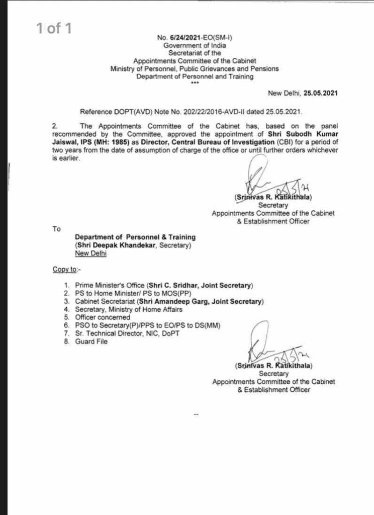 *B B C टाइम्स इन* 25 मई महाराष्ट्र के पूर्व पुलिस महानिदेशक ( डीजीपी ) सुबोध कुमार जायसवाल को मंगलवार को केंद्रीय जांच ब्यूरो (सीबीआई) का नया निदेशक नियुक्त किया गया। प्रधान मंत्री नरेंद्र मोदी के नेतृत्व में एक उच्चाधिकार प्राप्त समिति के दौरान यह निर्णय लिया गया, इसमें भारत के मुख्य न्यायाधीश एनवी रमना और कांग्रेस के लोकसभा के नेता अधीर रंजन चौधरी शामिल थे।